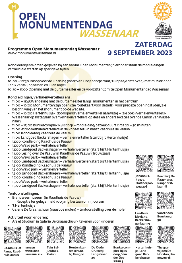 Zaterdag 9 september 2023 is het weer Open Monumentendag in Wassenaar. Het is een unieke combinatie van Wassenaarse organisaties die de Open Monumentendag mogelijk maakt. Rotary in Nederland bestaat 100 jaar in 2023, Rotary in Wassenaar bestaat bijna 75 jaar. Dit was voor de Rotary Club Wassenaar reden iets speciaals te doen dat blijvend is voor de Wassenaarse gemeenschap. Wat beter dan samen met de Historische Vereniging Oud Wassenaer de Open Monumentendagen weer te gaan organiseren? Een Comité is gevormd, begin dit jaar, met leden van beide organisaties dat met grote voortvarendheid de 2023 Dag organiseert.