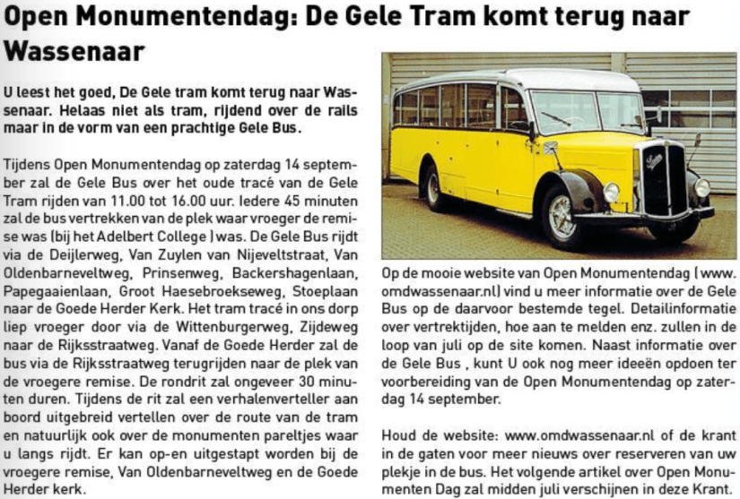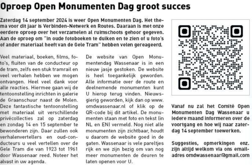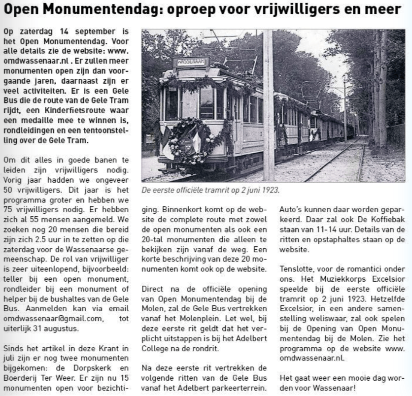 Noteer 9 september alvast in uw agenda, blijf ons volgen in de krant of via de website. De komende maanden volgt nog meer informatie. Suggesties, vragen en opmerkingen zijn welkom. Wij zijn te bereiken via monumentwassenaar@gmail.com
